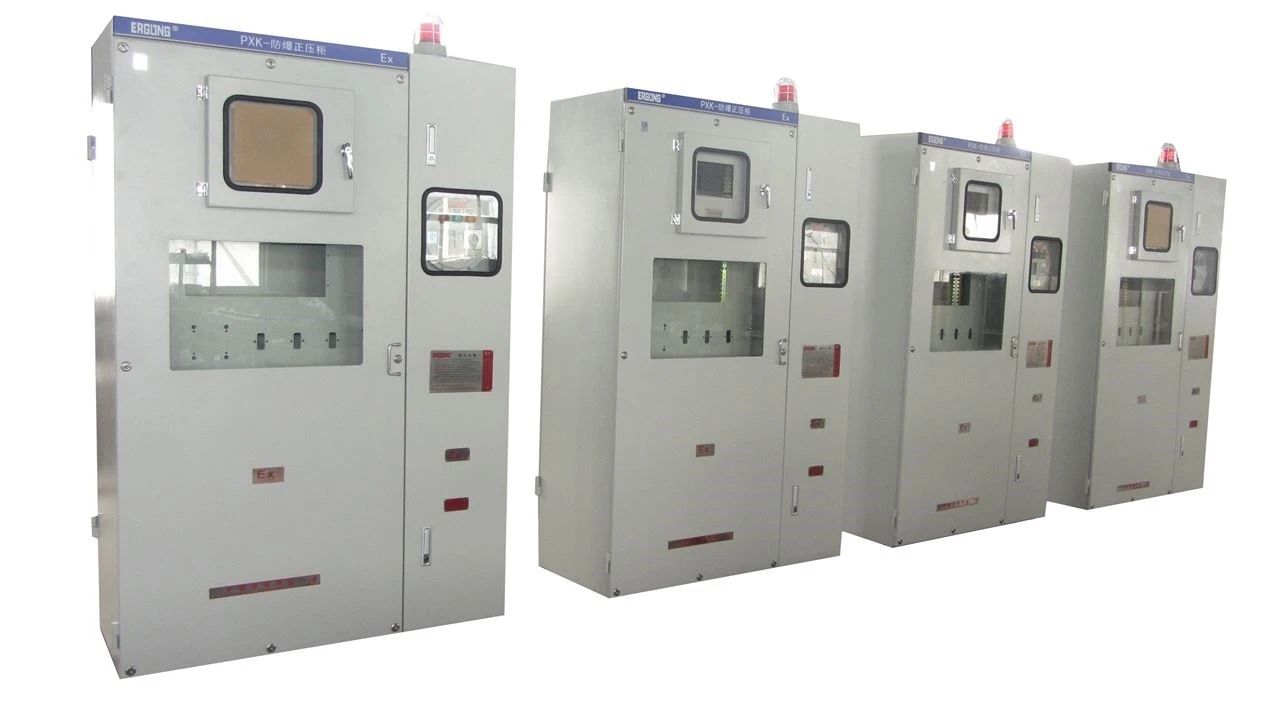 配电柜在自动控制系统的控制下,通入保护气体,正压腔内压力高于正压腔外的压力,形成微正压的安全小环境,从而阻止了可燃性危险气体进入正压腔内,保证内装普通仪表和电器元件的安全运行。