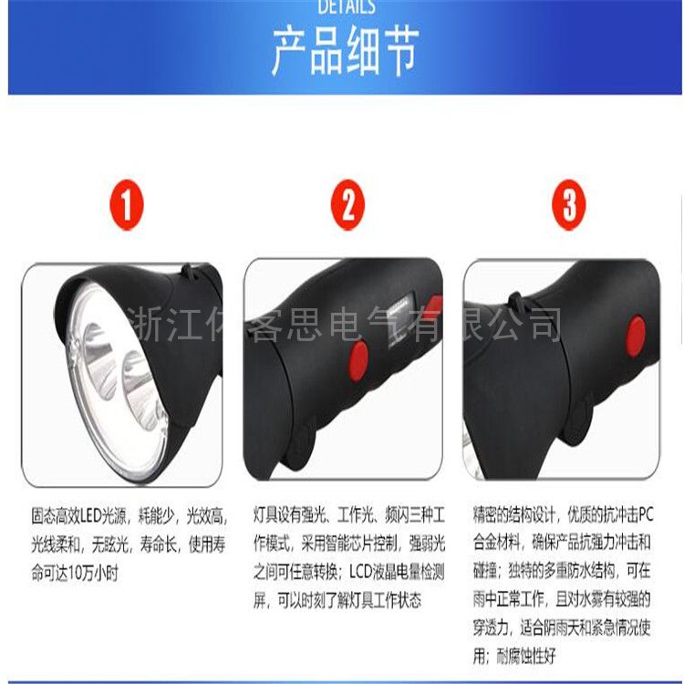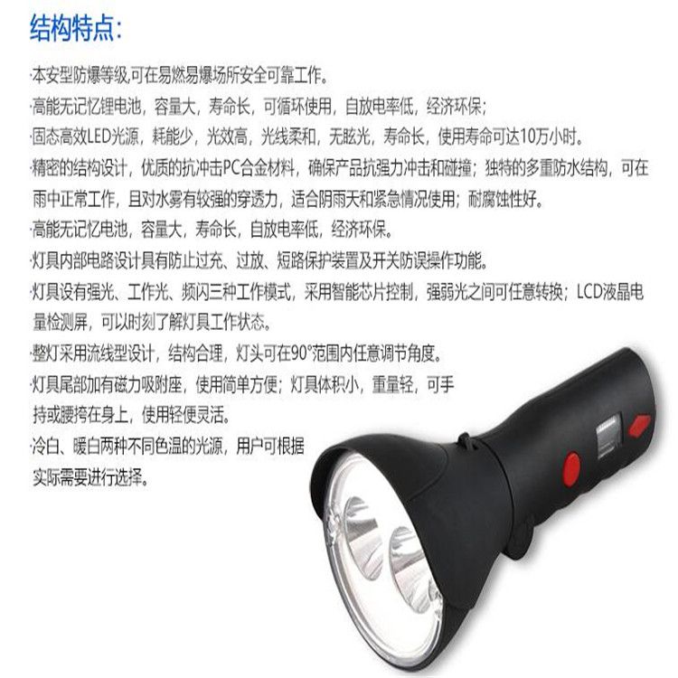 详细信息| 询价留言品牌:依客思 型号:EKS6050A 光源类型:LED 光源功率:2*3 w 电压:DC3.7 v 防护等级:IP66 主要适用范围:适用于铁路、航运、部队、电力, 加工定制:是 防护等级:IP66 -
